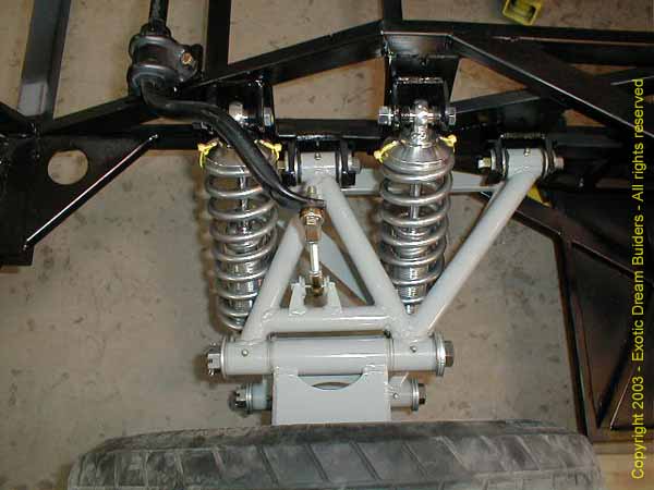 The suspension again is based on the same design and geometry as the original car. The rear suspension is comprised of dual coil over with the same hub to hub dimensions as an authentic Lamborghini. The front has the single coil over system and is dimensionally correct. Click on the picture below to see the details of the suspension.